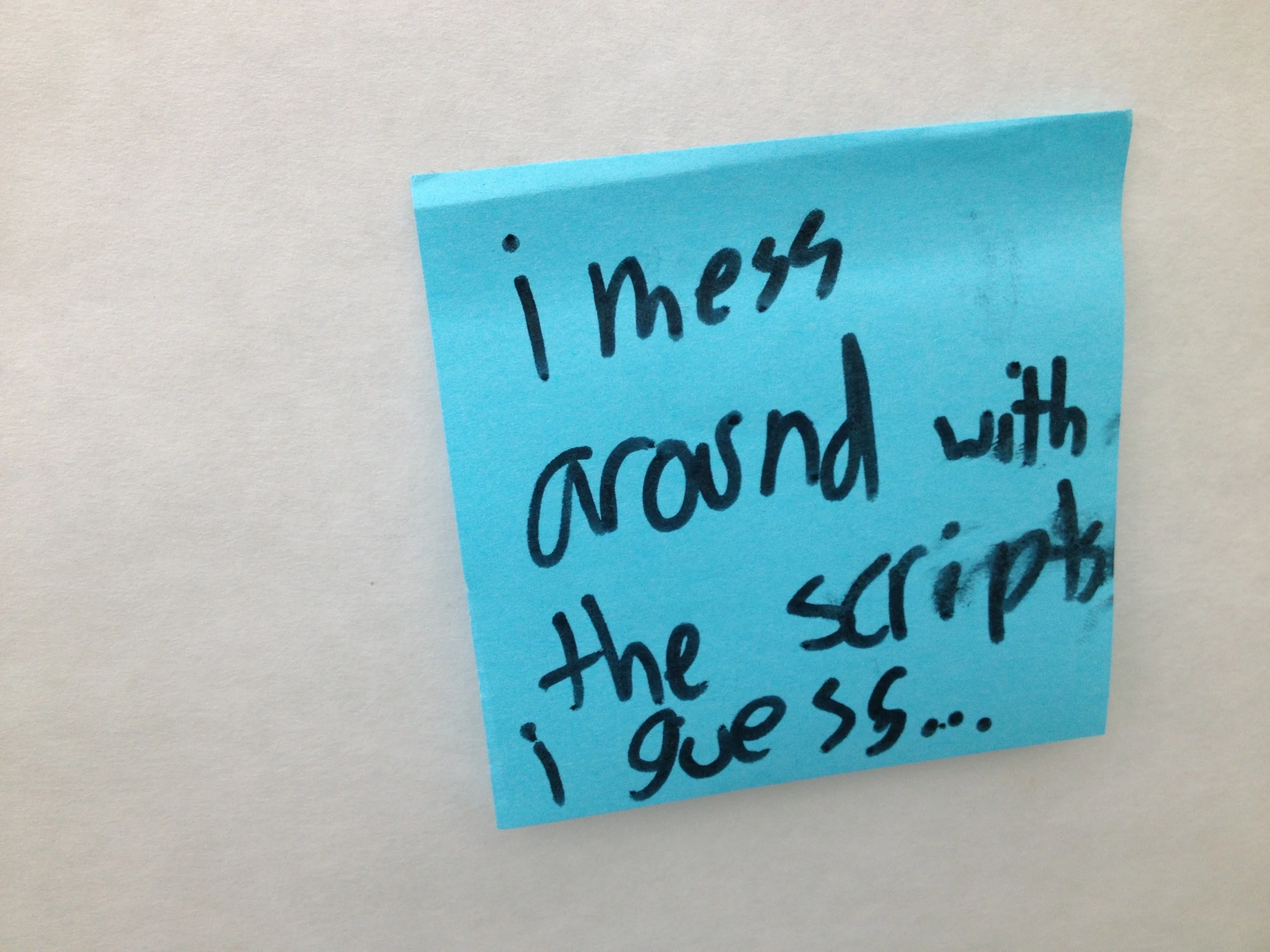 I took this photo at Scratch Day 2013 at MIT. It was posted on a wall where participants were asked to write down what they did when they got stuck in Scratch. If you are the kid who wrote this, thank you.